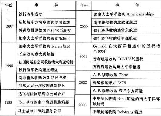 (1)世界航運(yùn)并購(gòu)戰(zhàn)略危機(jī)前世界海運(yùn)市場(chǎng)壟斷格局提升到新高度。近20年,世界跨國(guó)航運(yùn)公司在海運(yùn)市場(chǎng)的壟斷推進(jìn)戰(zhàn)略風(fēng)起云涌,不僅使世界海運(yùn)市場(chǎng)額獲得絕對(duì)的壟斷性提升,同時(shí),這些跨國(guó)航運(yùn)公司,特別是全球大型航運(yùn)公司已經(jīng)開始從戰(zhàn)略操作手段上進(jìn)行協(xié)同與合作。一方面通過岸線、港口資源共享,船舶艙位共同安排等作出協(xié)調(diào),運(yùn)力共享機(jī)制等,以減少惡性競(jìng)爭(zhēng)帶來的損失;另一方面,跨國(guó)航運(yùn)公司還在航線上減少競(jìng)爭(zhēng),并通過不同航線的整合實(shí)現(xiàn)一體化供應(yīng)鏈,形成整體競(jìng)爭(zhēng)優(yōu)勢(shì),獲得共贏。